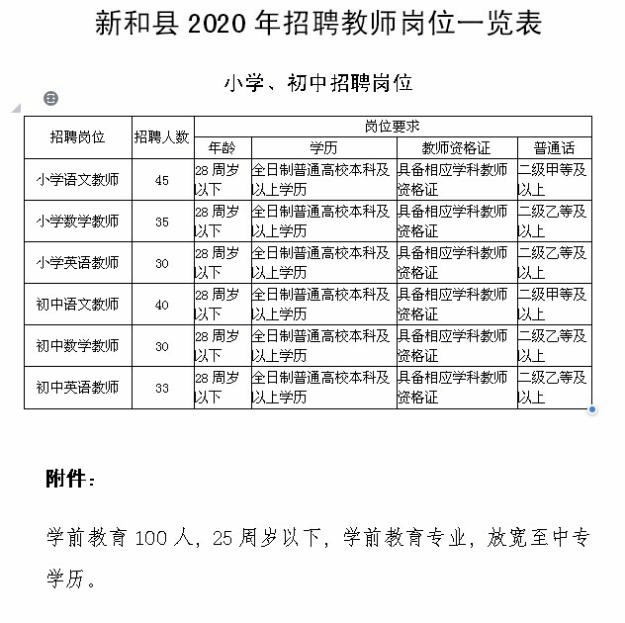 新和县2020年招聘应届、往届毕业生350名,其中学前100人,小学110人,初中103人,高中37人。